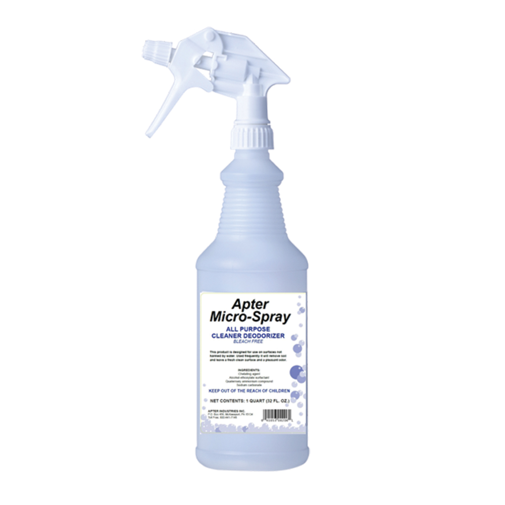 Apter Micro-Spray utilizes fast acting surfactants to physically remove soil, bacteria, and viruses. It also contains a form of organic chlorine that works without the corrosiveness and odor of bleach.