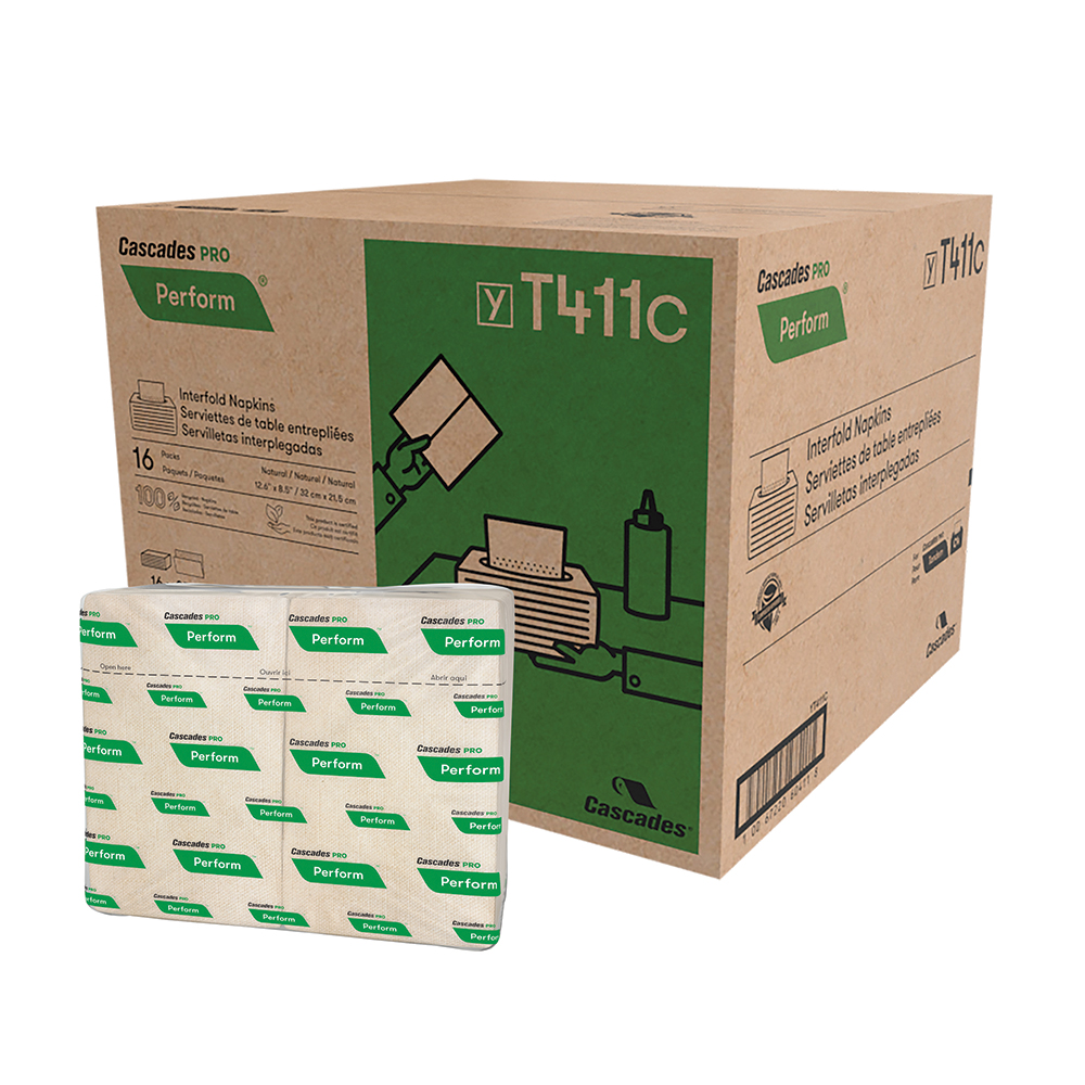Help reduce napkin consumption and waste in foodservice settings, cafeterias, ice cream stands and fast-food restaurants with Cascades PRO Perform® Interfold Natural Napkin twin packs. Dispensed one-by-one with a Cascades PRO Tandem® dispenser, these napkins deliver consistent quality while allowing more cost-effective and hygienic use. Natural brown in colour and made from 100% recycled fibre, these napkins are respectful of the environment. With 376 sheets per pack, each napkin is 1/4 folded, ensuring convenient individual dispensing. Ideal for high-traffic locations, these napkins are compatible with Tandem® C4 interfold napkin dispensers. The larger packs help limit the frequency of dispenser refills. Suitable for industrial and municipal composting facilities, but not for home composting.
