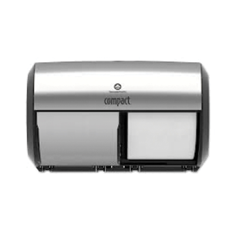 A high-capacity, wall-mounted toilet tissue dispenser designed for commercial restrooms. Holds two coreless rolls and delivers up to six times the capacity of standard rolls, reducing maintenance and waste. Features a durable, lockable design with a sleek brushed steel finish for a professional appearance.