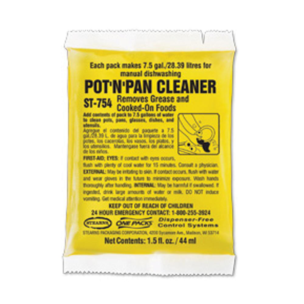 One packet per 7.5 gallons of water. Manual dish wash compound that is excellent for emulsifying high-fat content on pots, pans, steam tables, and for other heavy-duty cleaning.