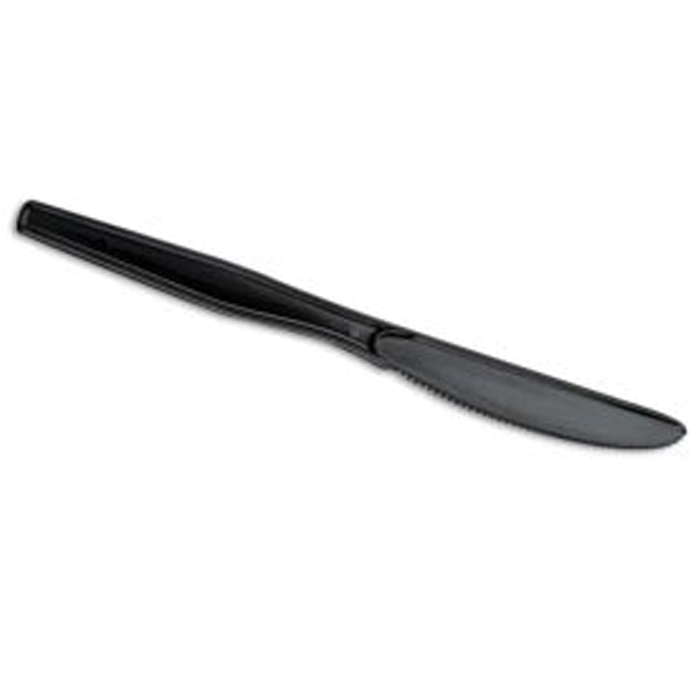 Disposable plastic knife for use with many dense foods such as hard fruits, fibrous vegetables, steak, and other dishes. Made of polystyrene for rigidity and durability.