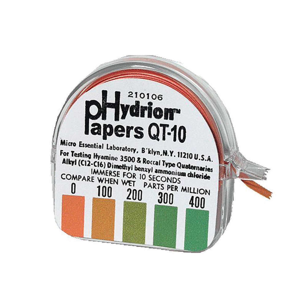 Hydrion QT-10 Quaternary Test Paper provides a simple, reliable, and economical means to measure the concentration of Quaternary Sanitizers. With color matches at 0-100-200-300-400ppm (parts per million), the test paper measures concentrations between 0-400ppm