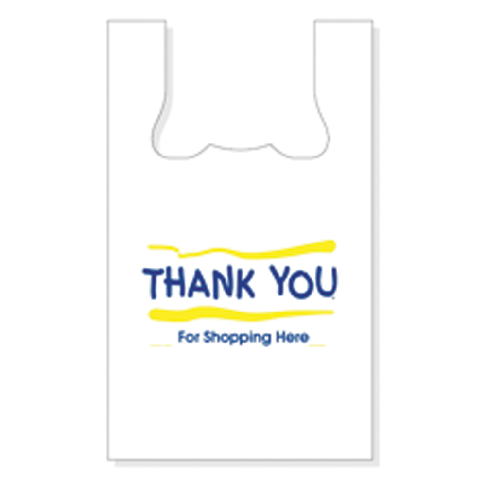 Thank you design on white plastic bag. Ideal for use at the checkout counter.
