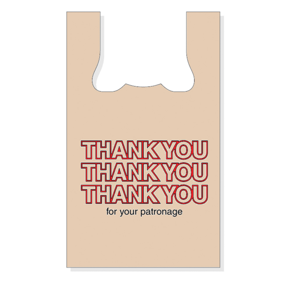 Thank you design on 12 micron buff plastic bag. Ideal for use at the checkout counter. Contains 35% recycled content.